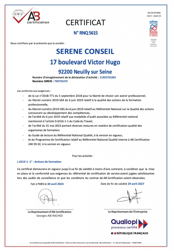 Nous travaillons au plus près de nos clients pour limiter les transports. Tous nos formateurs travaillent avec nous depuis des années et utilisent les supports fournis par Serene Conseil. Ils suivent une formation pour acquérir le contenu et l’approche pédagogique Serene-conseil. cette formation dure la même durée que le module lui-même.